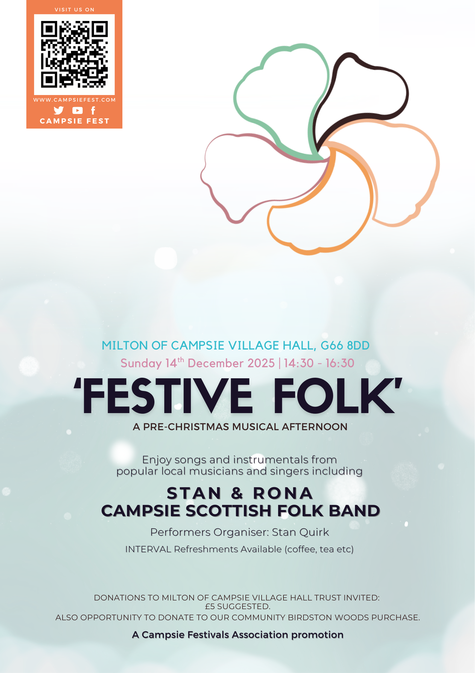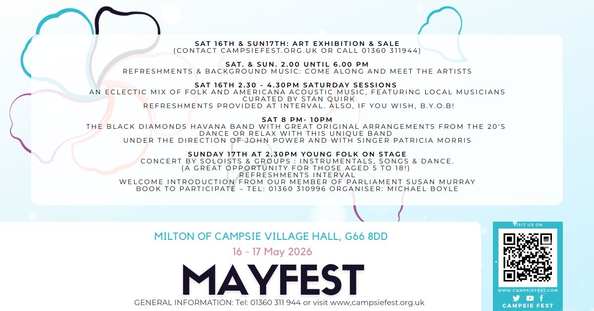 All donations go to “Milton of Campsie Village Hall Trust”, a registered charity run by volunteers and which provides the Hall FREE for the Campsie Festivals. The Campsie Festivals Organisation is run by volunteers and hopes that members of the community will express appreciation for all the FREE events presented by donating to Milton of Campsie Village Hall Trust.
